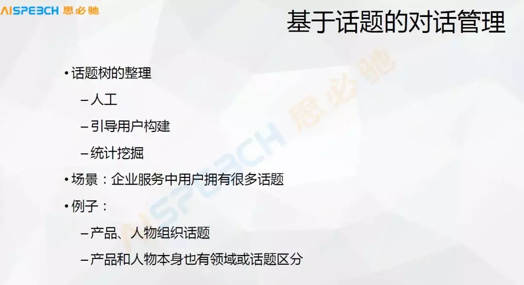 在启发式对话里边还有一种基于话题的对话管理,首先话题本身,因为它引入了一个新的概念就是话题,在问用户的问题之外引入了话题,话题可以是人工建的,也可以是系统自动计算出来的,也可以是系统引导用户来创建,这个话题就是我刚才在最开始讲启发式对话的时候,我们看到的,比如说关于花的一些相关话题的组织,也可以通过一些学习的方式去挖掘问题之间有哪些话题,特别在一些企业服务的场景中,因为企业本身有它明确的应用场景,所以它是有一些话题,它本身已经组织好的关于这些话题的组织。
