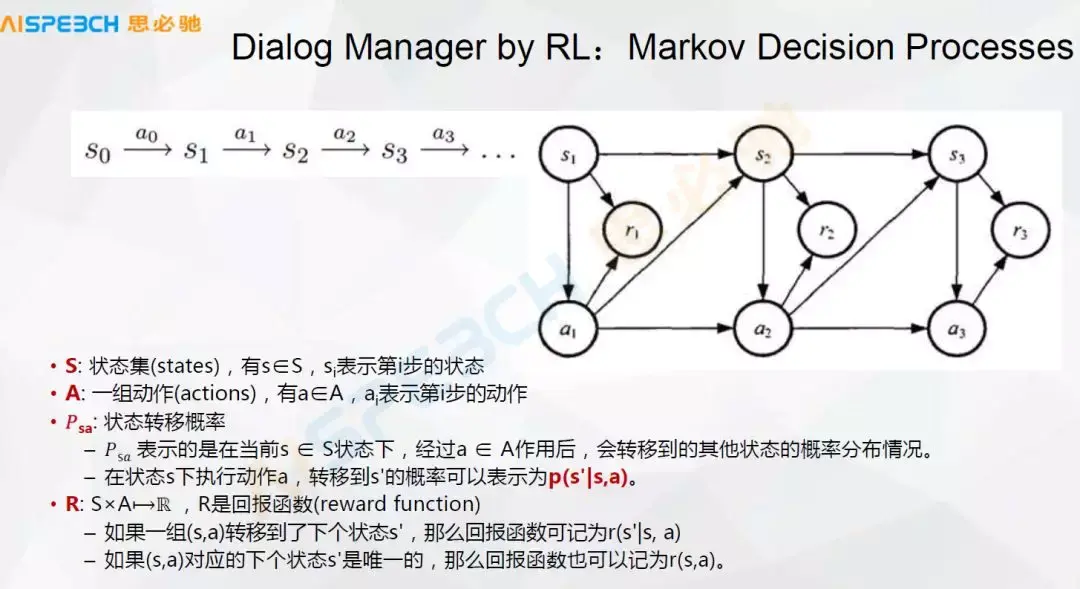 对话的管理,实际上一般情况下我们可以认为它是这种状态,这种状态转换的过程,比较典型的可能就是一个 Markov 决策过程,这里边 S 是一组状态集,A 是一组动作,在某一个状态下它遇到一个什么东西,然后要做一个什么样的响应或者什么样的动作,机器学习的方式可能就需要把这个对话组织成这样一个状态,在这里边一个重要的地方是需要有一些回报的函数。