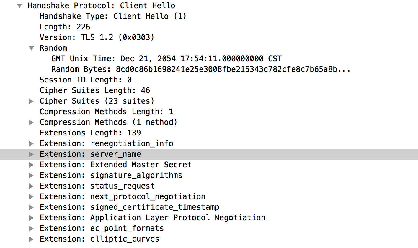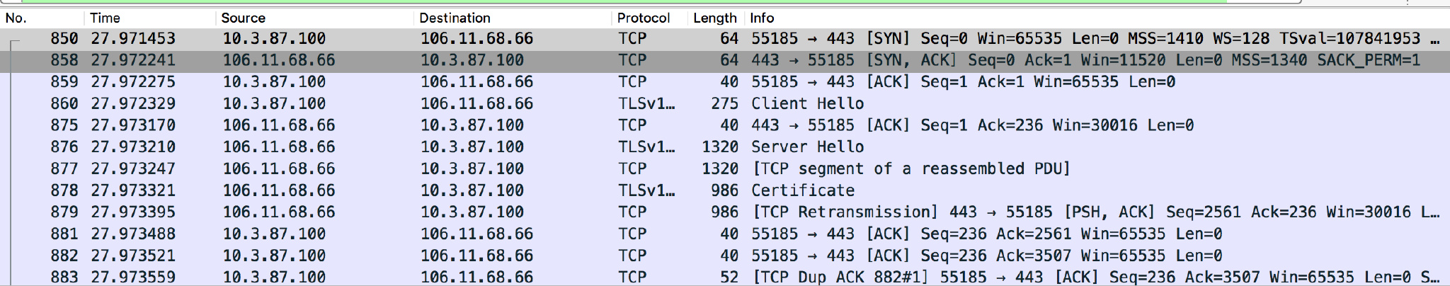 App 使用了 HTTPS 协议,在进行 HTTPS 握手之前,传输层方面会先经历三次握手。TCP 连接建立后,TLS 层客户端发送 Client Hello,开始进入 TLS 的握手流程。看下面图的前4行。