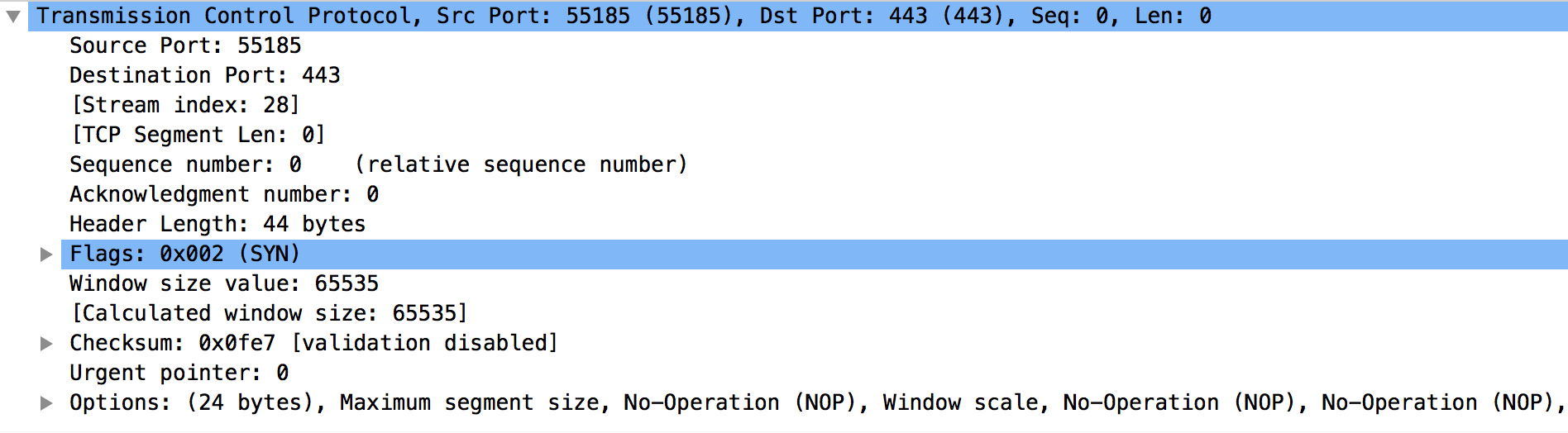 这个比较好理解,因为使用 HTTPS 通信,端口号默认采用443。第一次握手客户端向服务端发送 SYN,序列号 seq=0,Acknowledgment number =0。有些人可能感到疑惑:第一次握手不是SYN=1,ACK=0吗?需要注意一下,这里的Sequence number和 SYN 位是两个东西。常说的 SYN=1,ACK=0是 Control Flag 上的值,后面会说。Acknowledgment number =0是因为第一次握手,没有设置ACK,所以为0。Sequence number 是建立连接的时候由计算机生成的随机数作为其初始值,这里刚好为0,但并不是每次都为0.