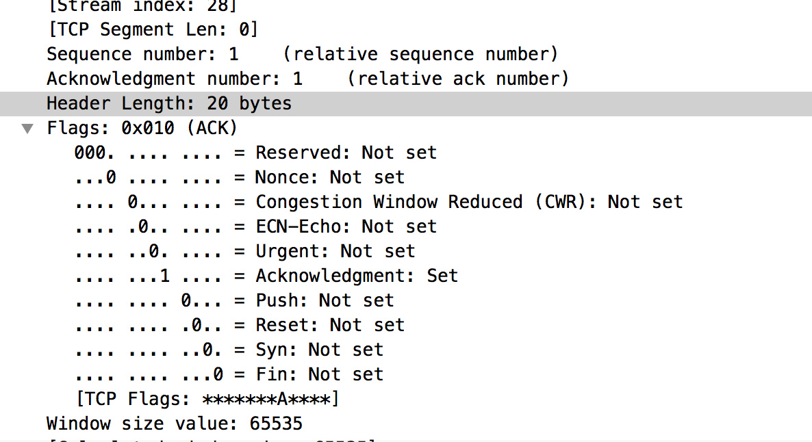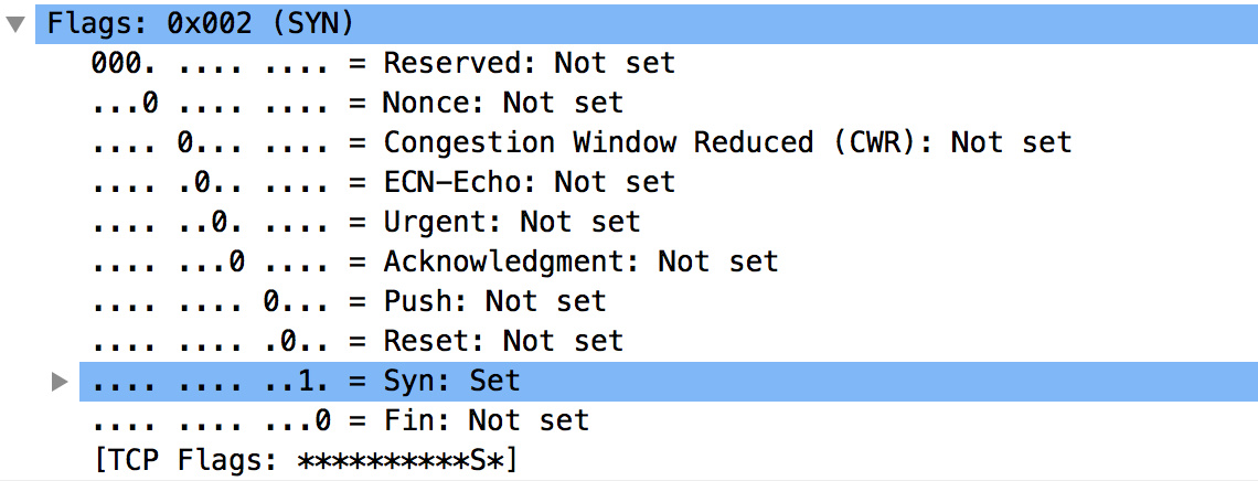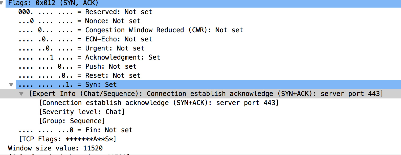 图中第一条高亮部分,即为 Flags,可以很明显地看到它后面注明了 SYN。一般来说 Reserved 右边为控制字段,由于上面说的争议性问题,所以我们换一种严谨一点的说法:NS位之后的8位,按照《图解TCP/IP》的说明,从左到右的标志依次为: