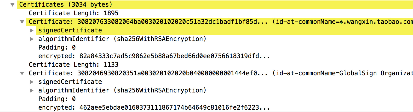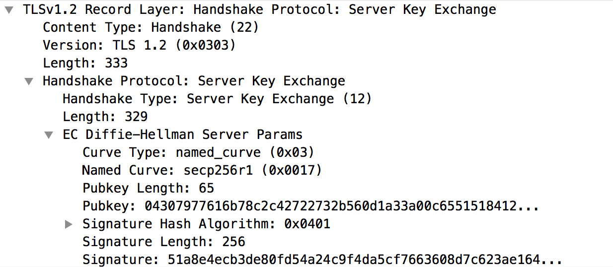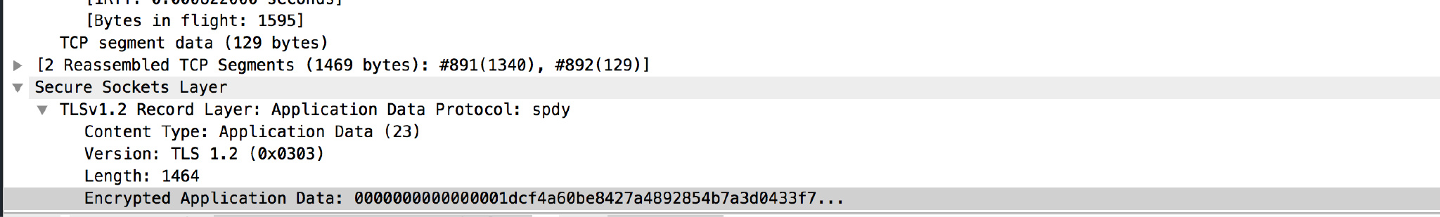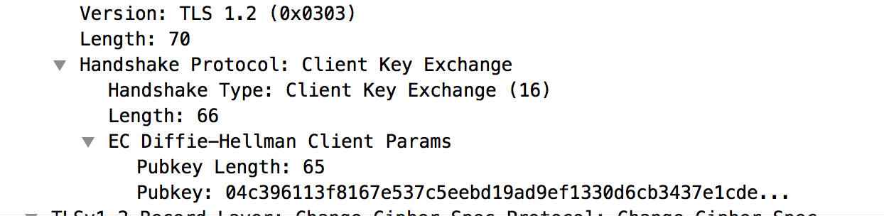 那么问题来了,之前说到 ClientKeyExchange 的时候,会发送经过加密的预备主密码,那么密文在哪里?当前在这里并没有看到,只看到用于加密的公钥。接着分析,极大可能是在下面两行的 Application Data 里发送的,我们可以看Application Data