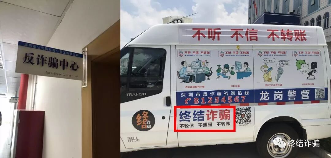 刚到了派出所,我们就惊奇地看到,龙岗分局的一个派出所竟然也成立了反诈骗中心,而且有数名专职工作人员负责反诈骗宣传与打击工作。所里的一台车也专门改造成为反诈骗宣传车,上面还印有我们终结诈骗 公众号的LOGO和二维码。