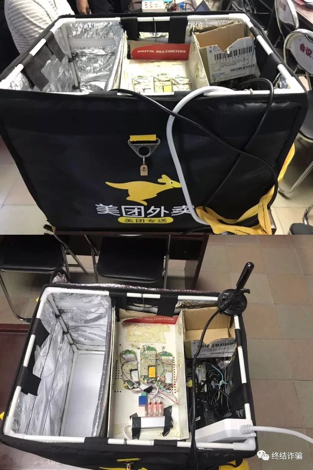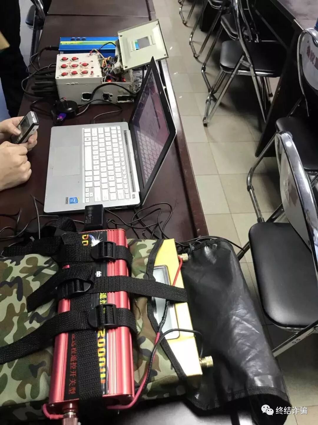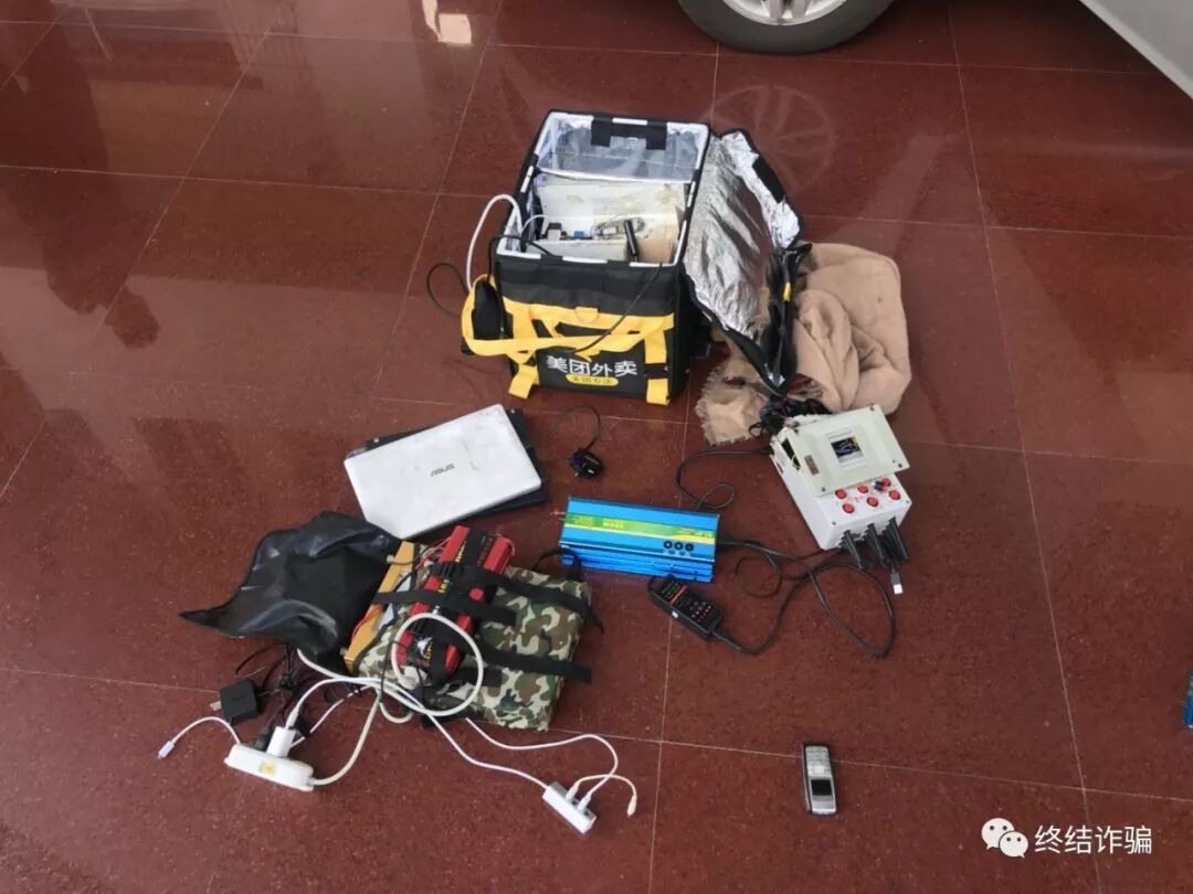 设备凌乱无章,竟然还有一个“美团外卖”的箱子!不过从图中可以看出,设备里有移动电源、插座、电脑、手机以及另外两个不知道是什么玩意的东西。由于要还原整个犯罪过程, 我们小心翼翼地把设备搬到一间会议室。并把使用该设备的小A“请”了出来。小A三下五除二就安装好了全部设备。