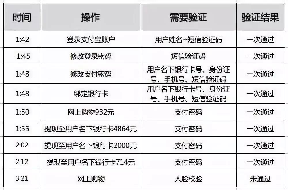 4.3时21分,嫌疑人想通过提现到银行卡上的钱进行购物,支付宝风控措施启动,要求人脸校验 ,没有通过后校验嫌疑人便放弃。此时,在支付宝上的消费也就是932元。