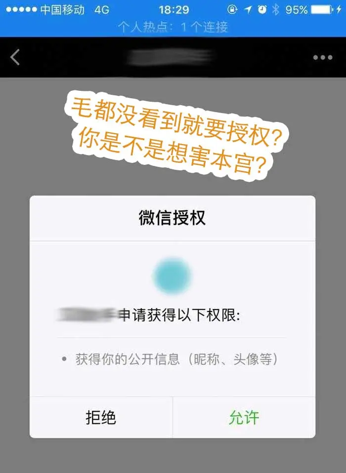 不妨站在用户的角度想一下:我什么都没看到,就让我授权?这究竟是个什么鬼?会不会是骗子啊?会不会把我微信钱包的钱弄走了?会不会盗我的微信号?