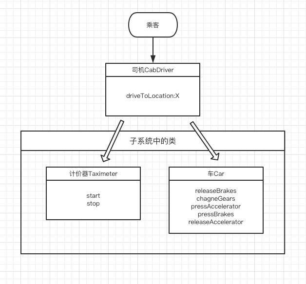 出租车司机就是外观,而车和计价器则是子系统,供司机操作。