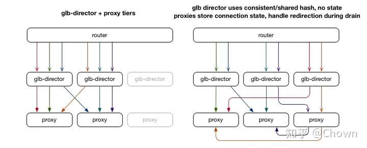GLB是一个4层负载均衡器,可以在多个物理机上扩展同一个IP地址,而且在后端服务器变更时最小化连接中断时间,改进了之前ECMP和LVS+状态存储的方式。ECMP(Equal-Cost Multi-Path路由)是基于TCP四元组(源IP,端口号,目标IP端口号)使用一致性Hash来进行路由选择的。