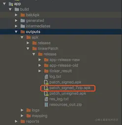 执行完成后,你会在你模块的build->outputs->apk->tinkerPatch->release下看到你需要的补丁包patch_signed_7zip.apk。