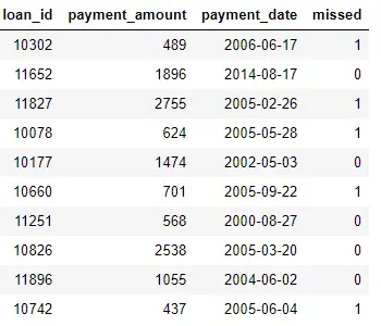 payments: 贷款偿还。每个付款只有一行,但是每笔贷款可以有多笔付款。