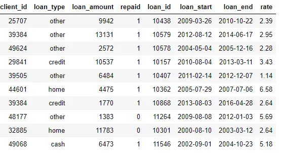 loans: 给客户的贷款。每个贷款在这个 dataframe 中仅占一行,但是客户可能会有多个贷款
