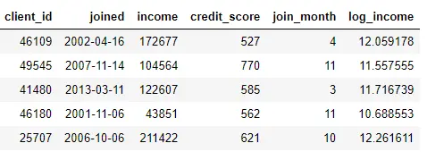 我们可以通过从 joined 列中寻找出月份或者对 income 列取自然对数来创建特征。这些都是转换的范畴,因为他们都是使用了单张表中的信息。