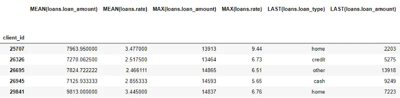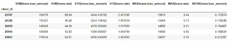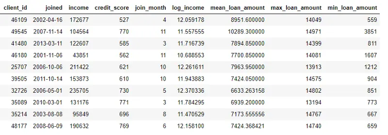 这个过程包括了根据客户进行贷款表格分组、计算聚合、然后把计算结果数据合并到客户数据中。如下代码展示了我们如何使用 Python 中的 language of Pandas 库进行计算的过程: