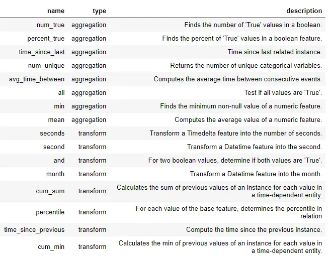 新特性是在 featruetools 中创建的,使用这些特征基元本身或叠加多个特征基元。下面是 featuretools 中的一些特征基元列表(我们还可以定义自定义特征基元: