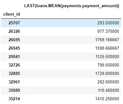 例如,MEAN(payments.payment_amount) 列是一个深度为 1 的特征,因为它是使用单个聚合创建的。深度为 2 的特征是 LAST(loans(MEAN(payments.payment_amount)) ,这是通过叠加两个聚合而成的: LAST(most recent) 在均值之上。这表示每个客户最近一次贷款的平均支付金额。