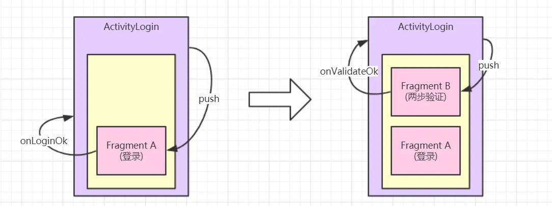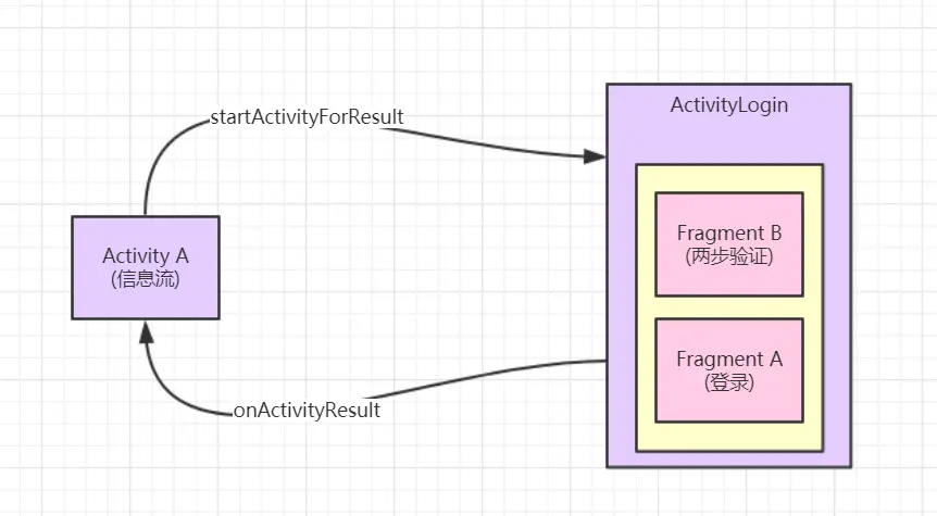 以登录流程为例(包含两个步骤:用户名密码验证、需要手机验证码的两步验证), 整个流程与流程触发点(例如首页信息流点赞操作)的交互以及流程内部 Fragment 栈如下图所示:
