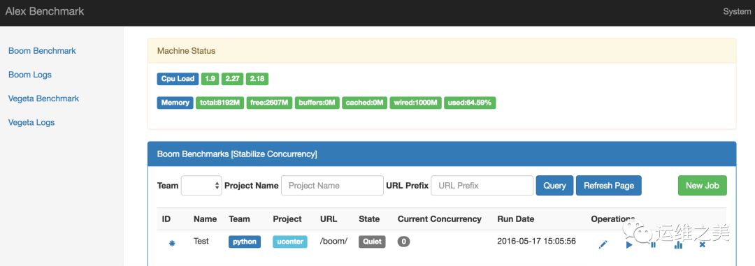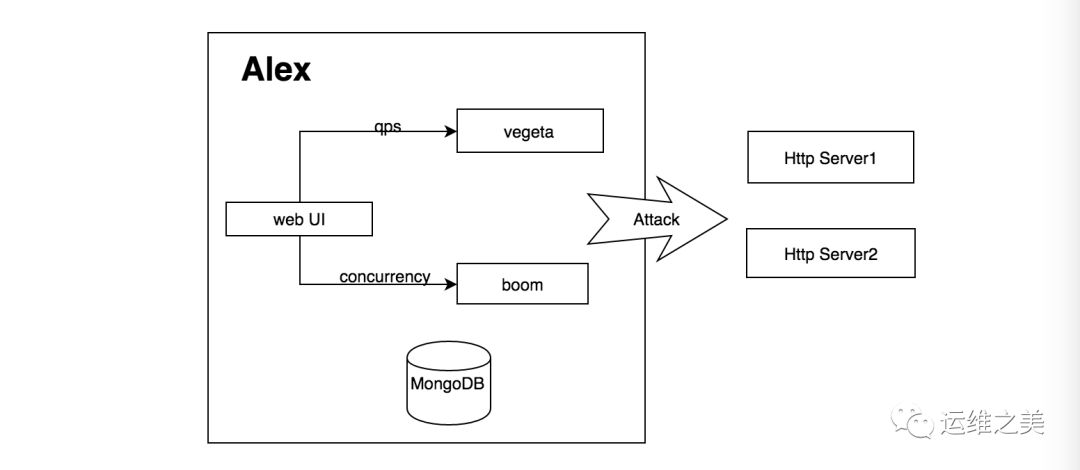 如果你觉得命令行下使用 Vegeta 比较复杂的话,你还可以使用 Alex 项目。Alex 是一个基于 Vegeta Library 和 Boom 封装的压力测试 Web UI,Vegeta 提供稳定的 QPS 压力源,Boom 提供稳定的并发数压力源。