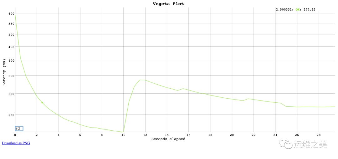 最后我们可以通过 vegeta report 命令生成此次压测的报表。vegeta report 命令可一次性读取使用逗号分隔的多个结果文件并生成报告,默认通过时间戳进行排序。