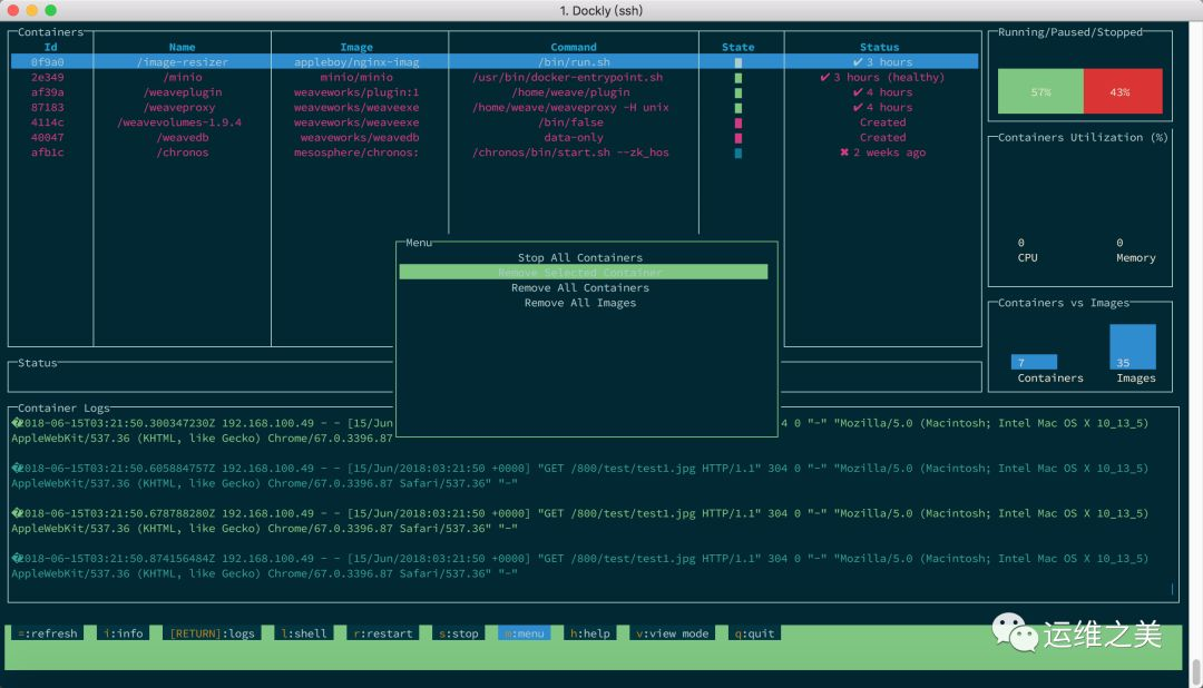 在选定容器上按下 m 键即可对容器进行一些管理。