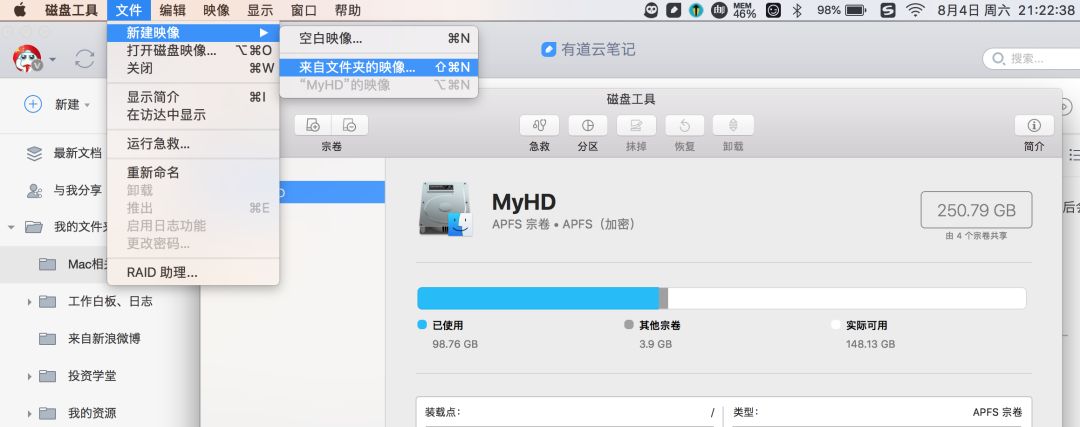 在“实用工具”中启动“磁盘工具”。选择“磁盘工具”菜单中的“文件 > 新建映像 > 来自文件夹的映像”命令并在打开的窗口中选择上一步创建的文件夹后单击“打开”按钮