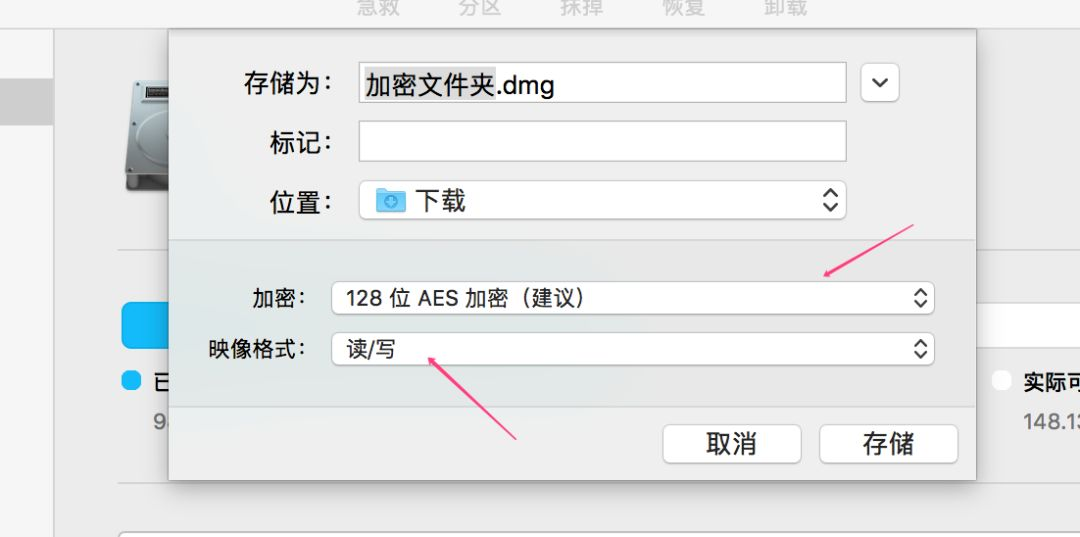 在弹出的对话框中的“存储为”文本框中输入创建的dmg文件名称,在“位置”下拉框中选择保存的位置,在“加密”下拉框中选择加密方式并按提示创建密码,在“映像格式”下拉框中选择模式(推荐选择“读/写”)。