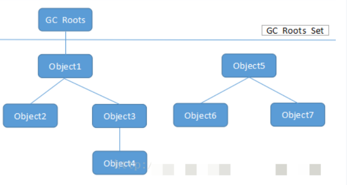 在程序开始时,会建立一个引用根节点(GC Roots),并构建一个引用图。当需要判断谁是垃圾时,我们可以从这个根节点进行遍历,如果没有被遍历到的节点则是垃圾对象,否则就是有用对象。如下图: