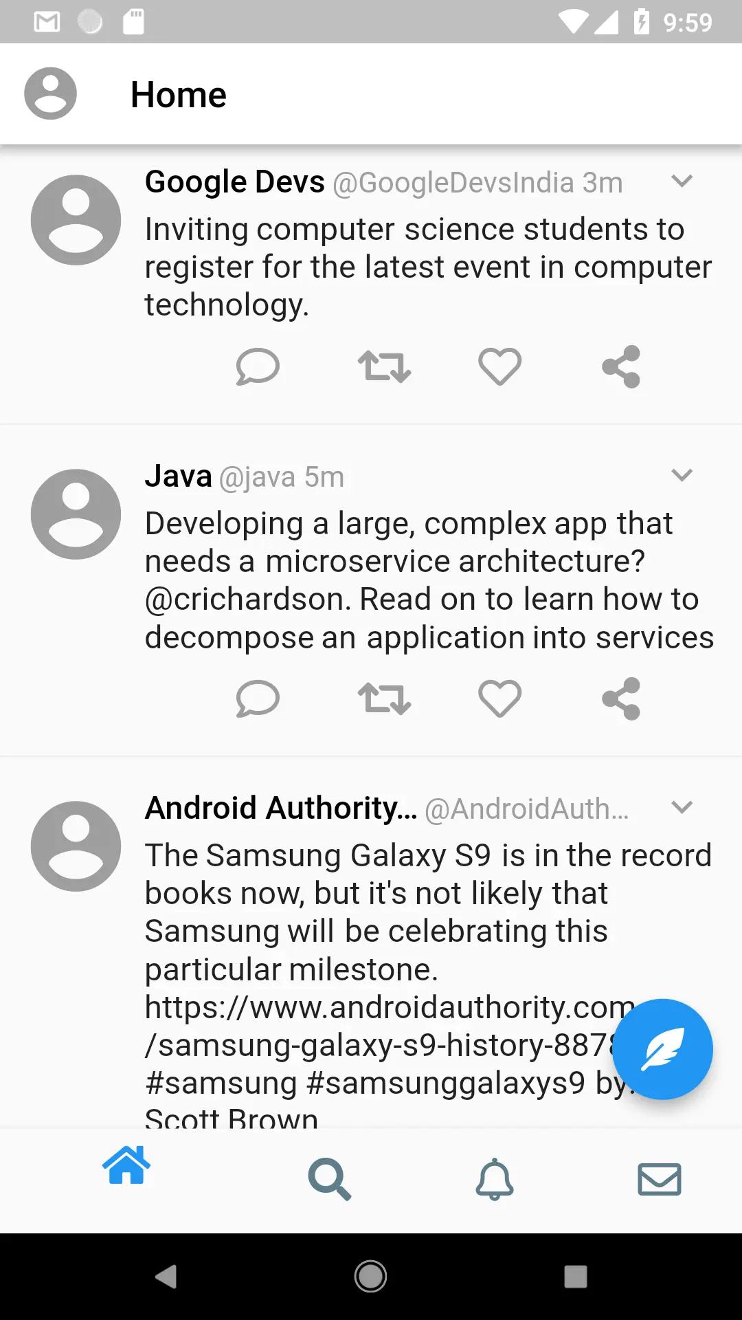 在创建一个用于提供简单推文的帮助类和一个简单的 FloatingActionButton 后,页面如下:
