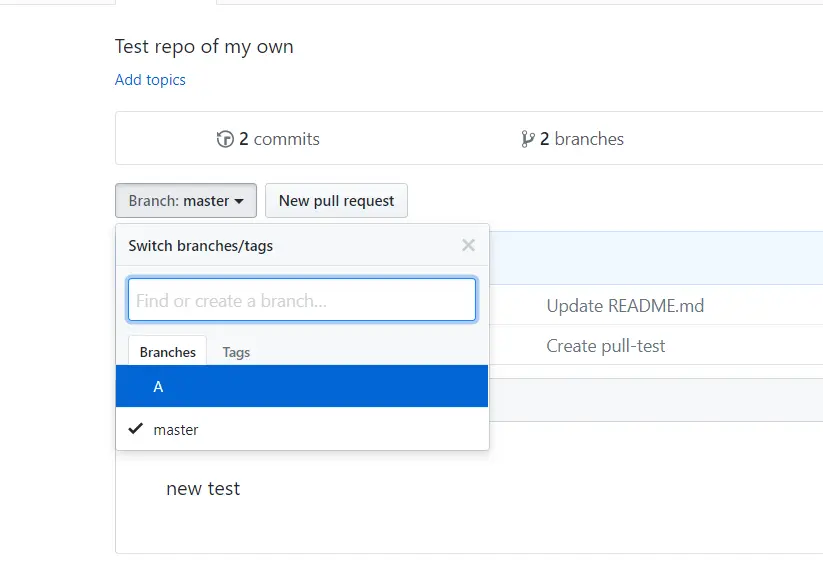 这时候我们切换到分支 A 中,将 README.md 的内容修改为:test from branch A