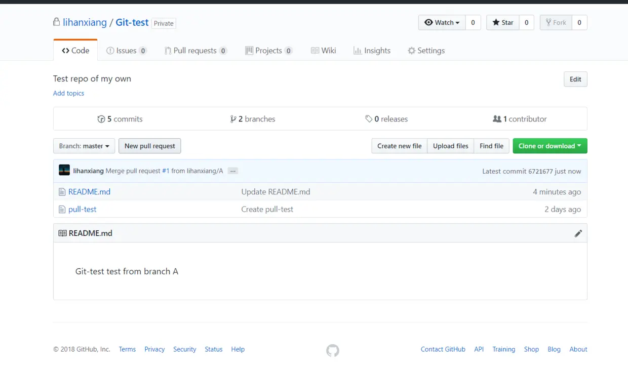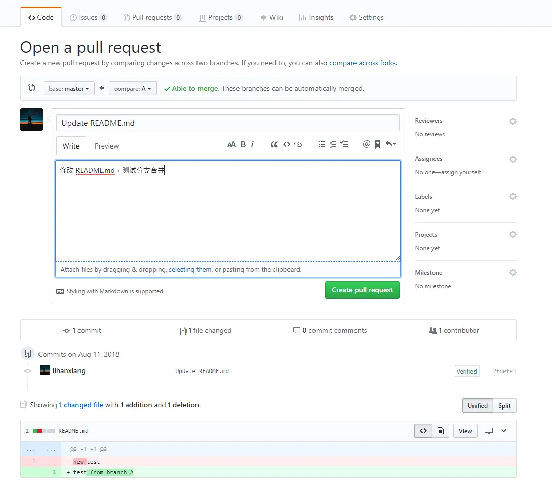 因为这里是我一个人操作的,所以拥有者和贡献者都是我,但是在其他情况下,贡献者一般不是本人,所以在这里需要说明一点,贡献完了之后,需要拥有者来点击 Merge pull request 这个按钮,才能将分支合并,贡献者是看不见这个按钮的