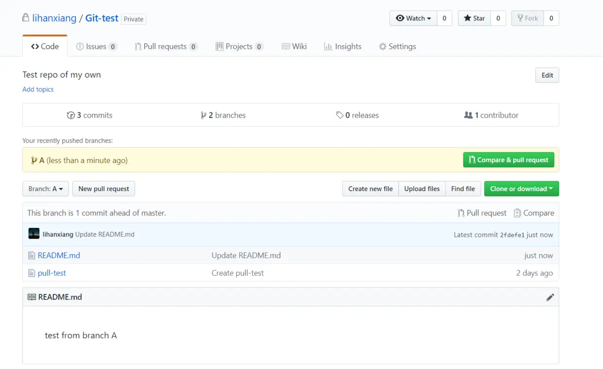 将 README.md 中添加一行:Git-test,然后提交至分支 A: