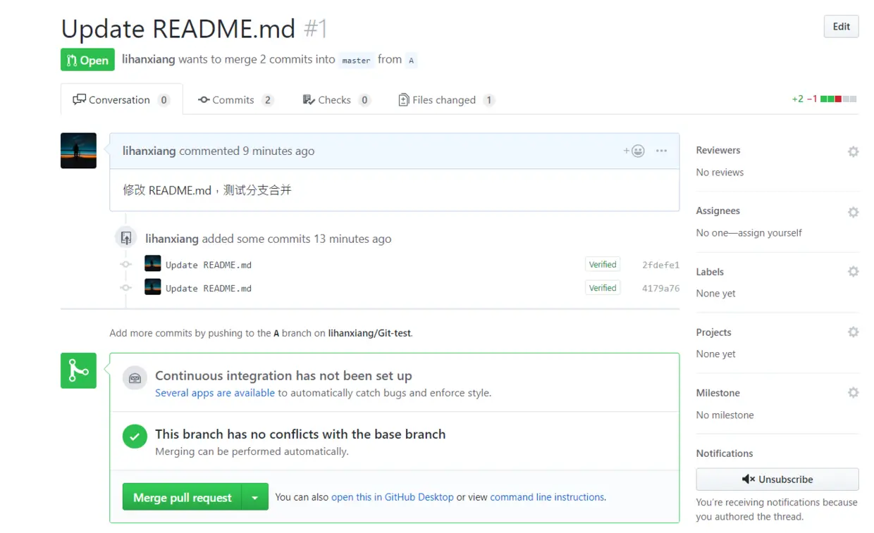 这里先不急着合并,来验证一下上面的说法,在创建 pull request 之后,如果有更新怎么办: