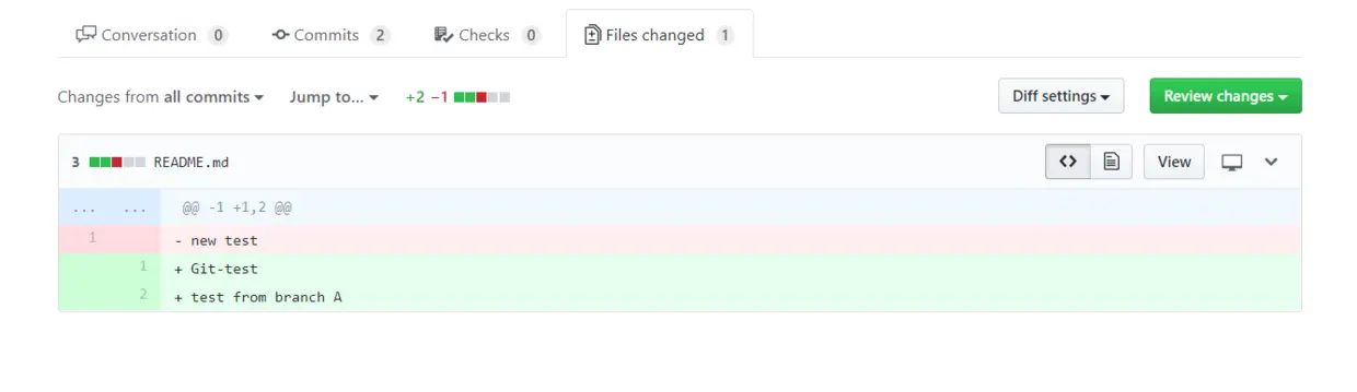 点击 Files changed 就会发现创建 pull request 之前的文件和现在的文件有什么区别: