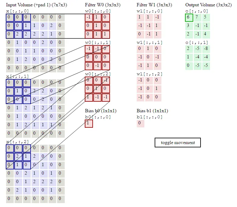 Filter W0表示1个filter助手,尺寸为3*3,深度为3(三个矩阵);Filter W1也表示1个filter助手。因为卷积中我们用了2个filter,因此该卷积层结果的输出深度为2(绿色矩阵有2个)。