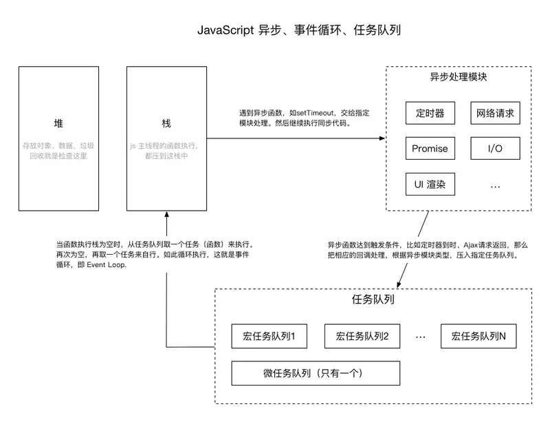 大家肯定都知道因为线程阻塞,定时器里的console并不会被输出,这就是因为我们的JS解释执行是单线程的,所以在执行过程中需要将同步和异步的两类代码分别压入同步堆栈和异步队列中,通过Event Loop实现异步操作: