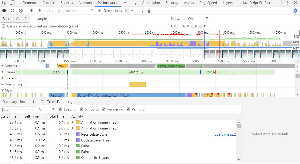 如果要验证我上述所言非凭空捏造,大家可以打开chrome开发者工具中的performance版块,录制一小段页面渲染,并将输出结果切换至Event Log版块,大家就可以清晰地看见网站渲染经历的过程: