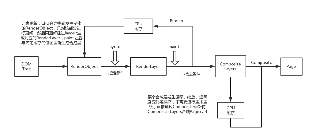 我们都知道,提升渲染性能的第一要义是减少重排重绘,我们之前也说过,在软件渲染的过程中,如果发生元素更新,CPU需要找到更新到RenderObject进行重新绘制,其中过程包括了重排和重绘。但如果页面只是某个合成层发生了位置的偏移、缩放、透明度变化等操作,那么GPU会取代CPU去处理重新绘制的工作,因为GPU要做的知识把更新的合成层进行相应的变换并送入Compositor重新合成即可。