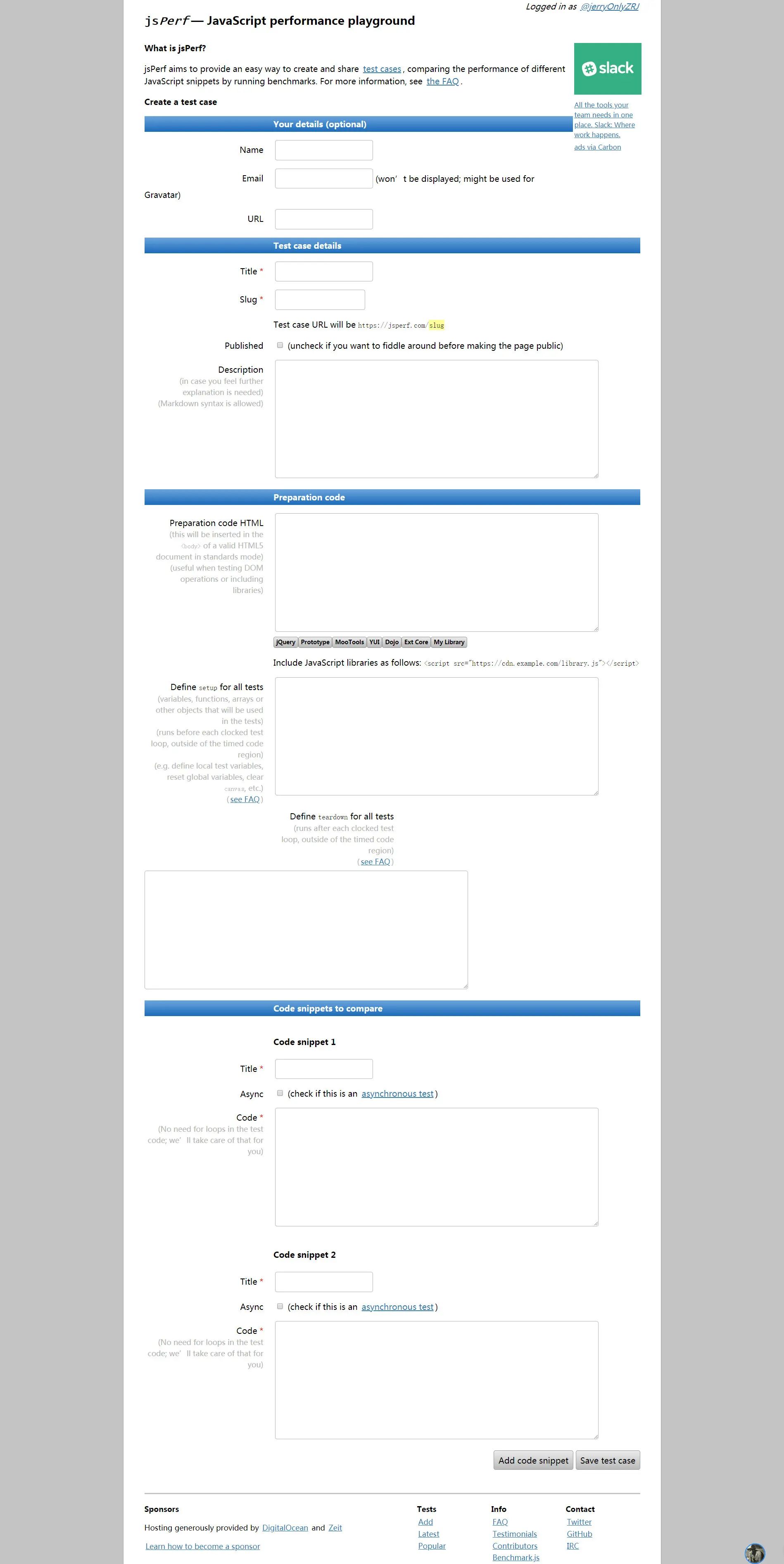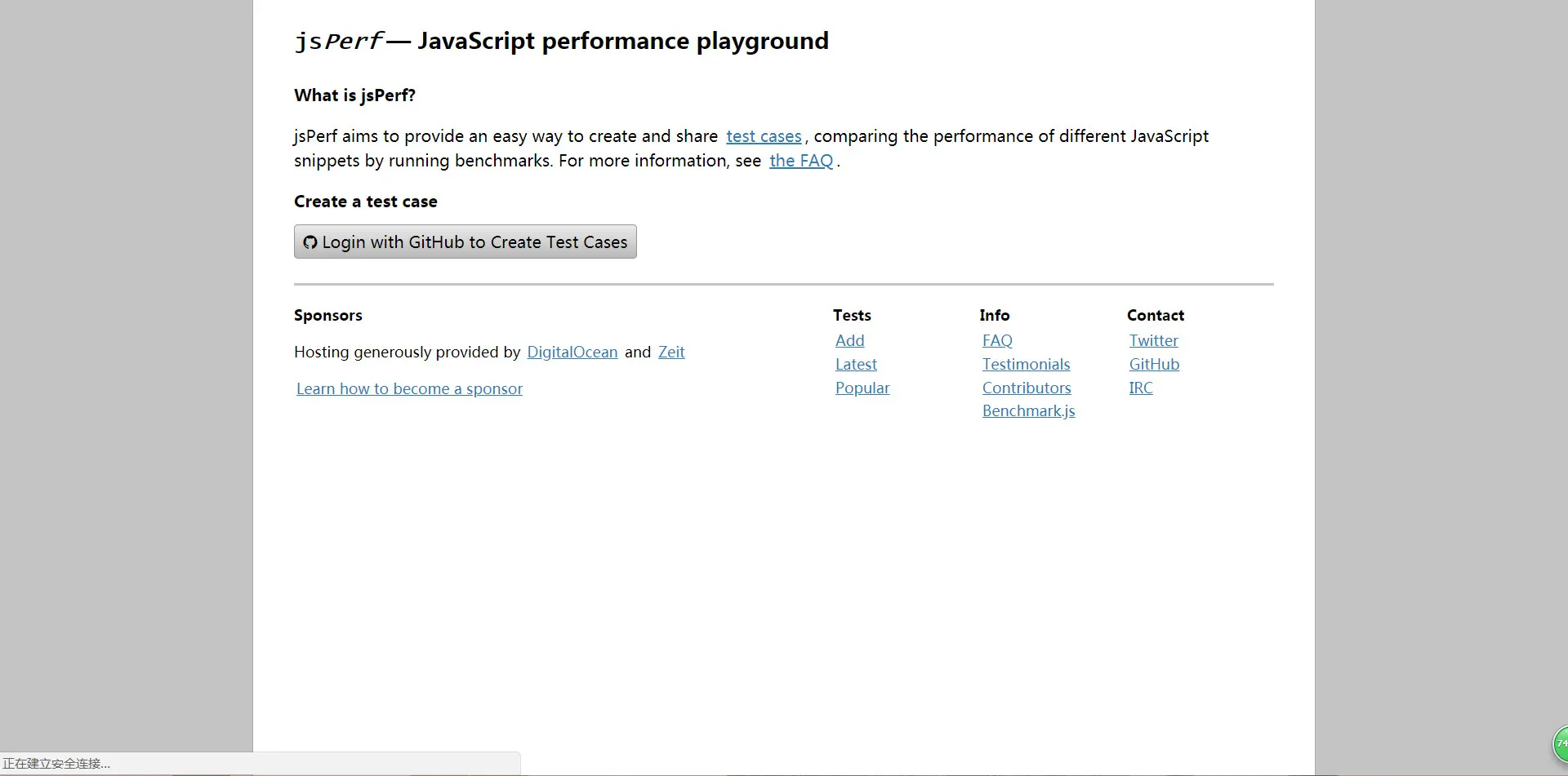 JsPerf和Benchmark的功能实际上是一模一样的,包括它的输出内容,只不过它是一款在线的代码执行监测工具,无需像Benchmark那样安装模块,书写本地文件,只需要简单的复制粘帖就行,传送门:jsperf.com/ (图片来自官网截图)