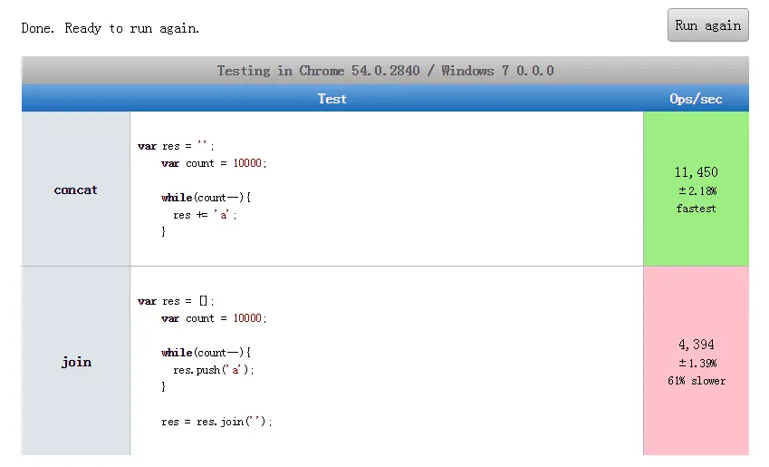 其中,Ops/sec 测试结果以每秒钟执行测试代码的次数(Ops/sec)显示,这个数值肯定是越大越好。除了这个结果外,同时会显示测试过程中的统计误差(百分比值)。