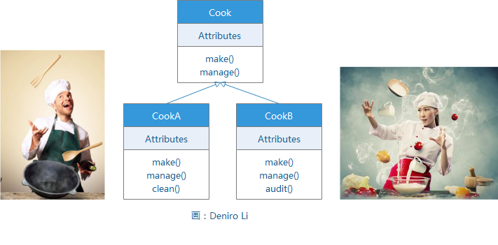 CookA 除了会做菜与管理外,还会清洁的技能;CookB 也具有审核的独门技能。