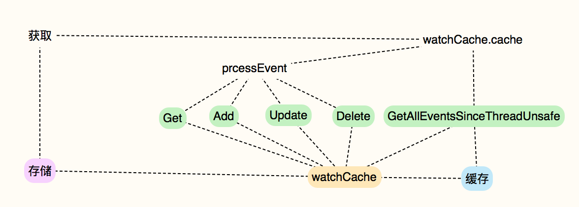 目前暂时理解了这些,有一点需要注意的, 这个地方是watchCache, 它会将所有的增删改查的操作都放到自己的cache里,但在Get时候,并不回去读取缓存中的数据,只有在watch中才回从当前的cache数组中读取对象, 接下来继续看cache, 后面得反过来再了解下