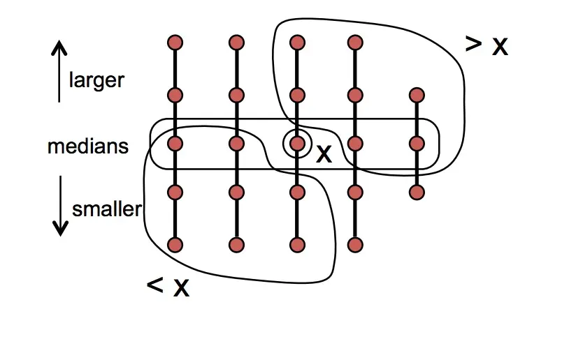 将S分成5列,这样它就是有多行数据,一共5列的二维数组,把每列进行排序,最大的元素在上头,最后x的取值为所有列中间取值的中间的值