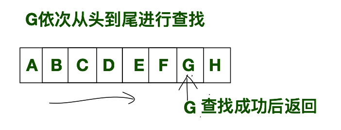 为了更直观的理解顺序查找,我们可以看一下下方的示意图。在查找表中存储着A~H的元素,我们要查找G元素在该查找表中的位置,我们需要从A开始以此匹配,当找到G时,就返回G在查找表中的位置。