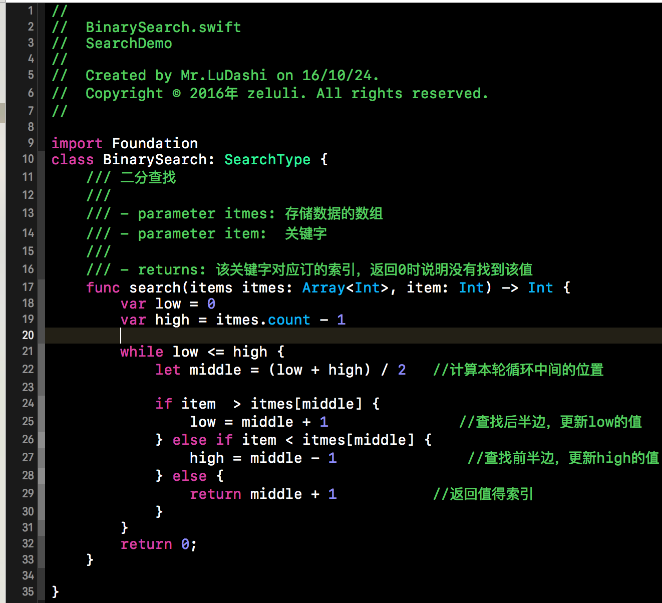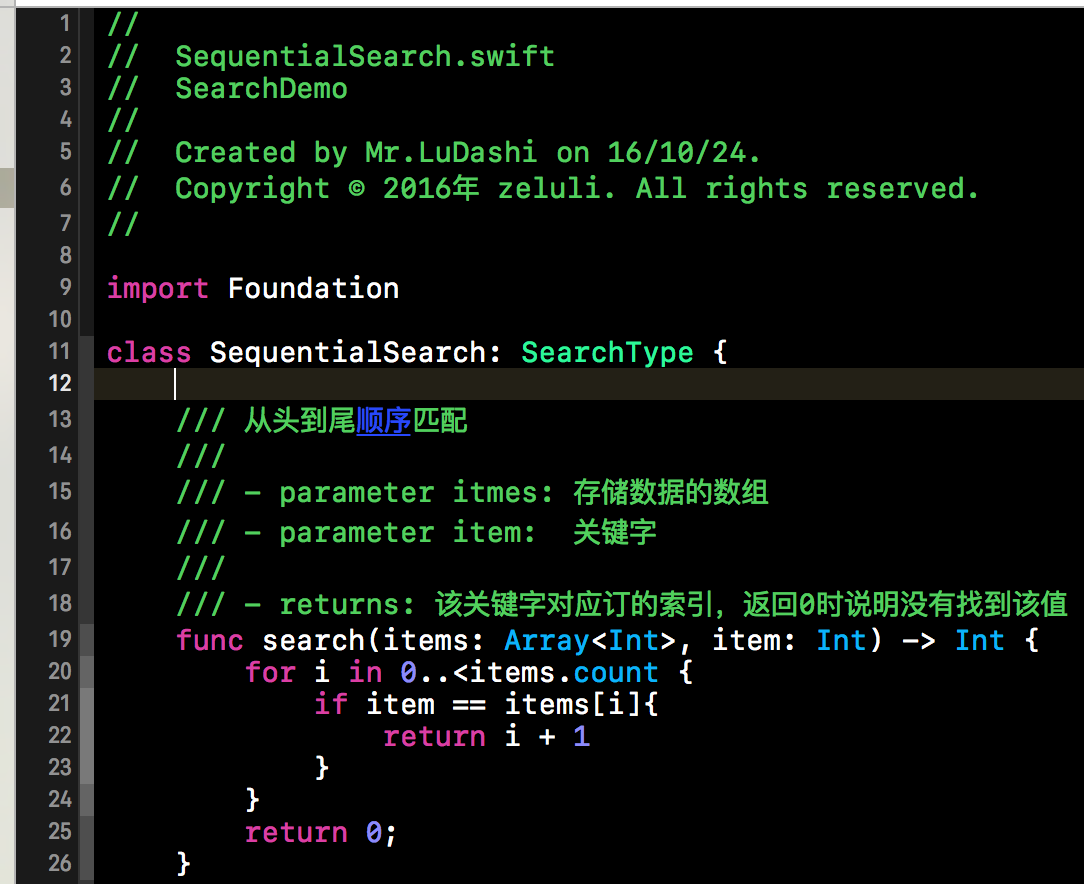 上面是一个完整的二分查找的实例,不过在上述实例中,只对low和mid的值进行了更新,因为都是抛弃了前半部分。当item<items[mid]时,我们就需要丢弃查找表的后半部分,更新上边距high的值。不难得出,上边边界high的值更新为high=mid-1。将查找表的范围缩小到前半部分继续查找。根据这些叙述,我们不难给出代码实现,下方代码段就是折半查找的Swift语言的实现。如下所示: