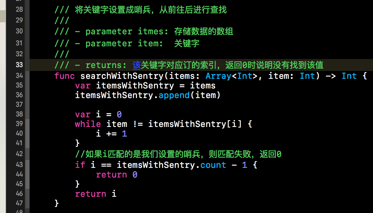 根据上面这个示意图,我们不难给出相应的代码实现。下方这个代码片段就是设置了哨兵的顺序查找方法。因为代码比较简单,在此就不做过多赘述了。