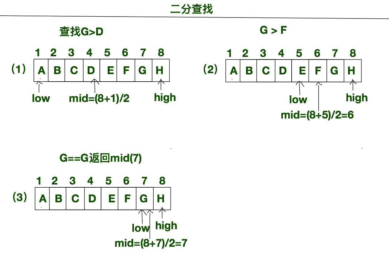 (3)由G>F这个结果,我们得出,上一轮查找表的前半部分的数据需要丢弃,所以要还需要更新low的值,low= mid + 1 = 6+1 = 7。 mid = (8+7)/2=7。此刻的mid处的元素是G, 所以找到的我们要找的值,返回mid = 7。