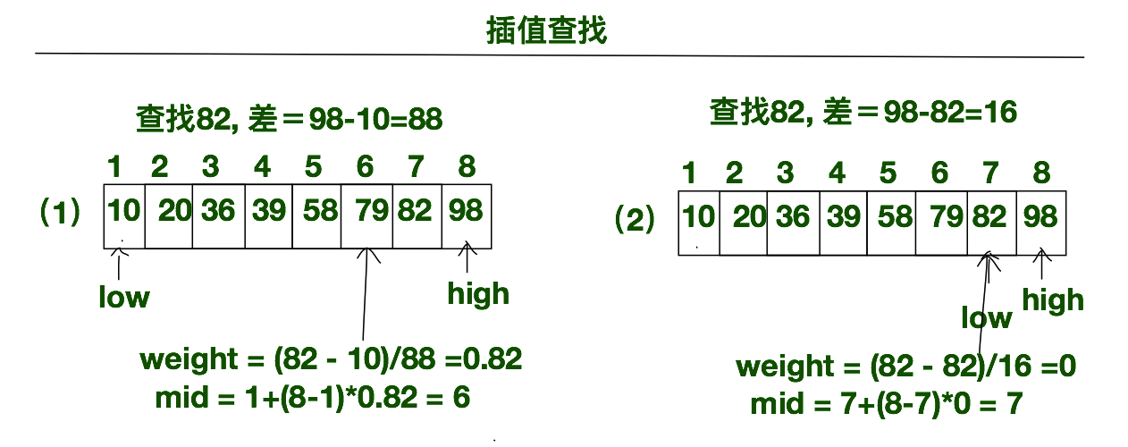 (1)、首先初始化我们查找表的范围low=1, high=8。计算我们关键字82在当前查找表范围内的权值weight=(key - low)/(high-low)=(82-10)/(98-10)=0.82。由权值,我们就可以容易的求出mid的值mid = low + weight*(high-low) = 1 + 0.82*(8-1)=6。所以我们将82与items[mid]=79进行比较, 可知82>79。