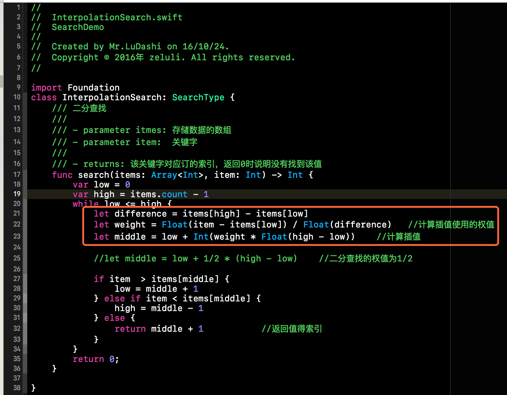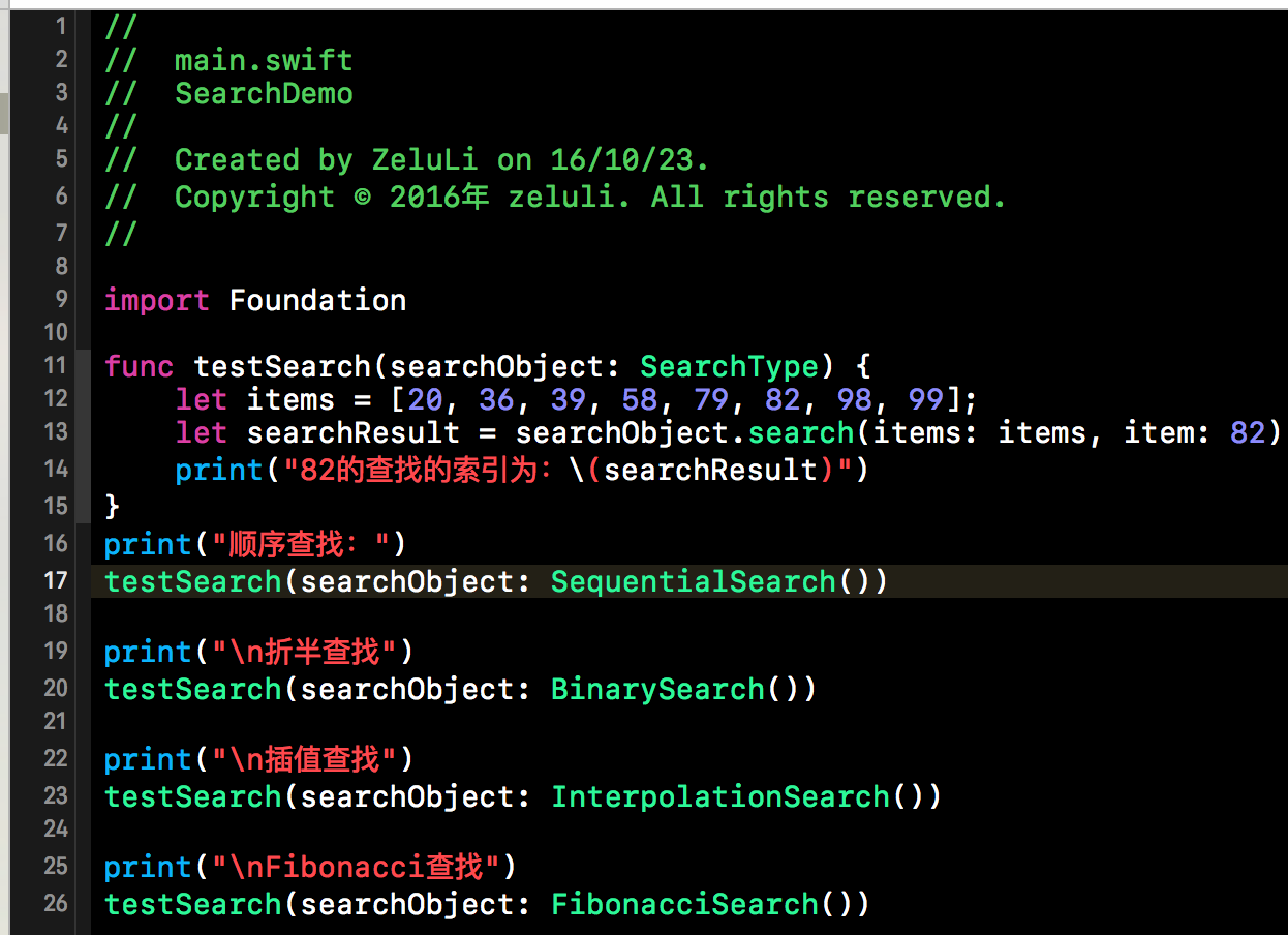 上述过程的代码实现并不复杂,只需要将折半查找中的mid的计算方式进行替换即可。下方的InterpolationSearch类就是我们插值查找的类,当然该类也要遵循SearchType协议。在下方代码段中,除了红框部分中的代码,其余的与折半查找的代码完全一致。代码比较简单,在此就不做过多赘述了。