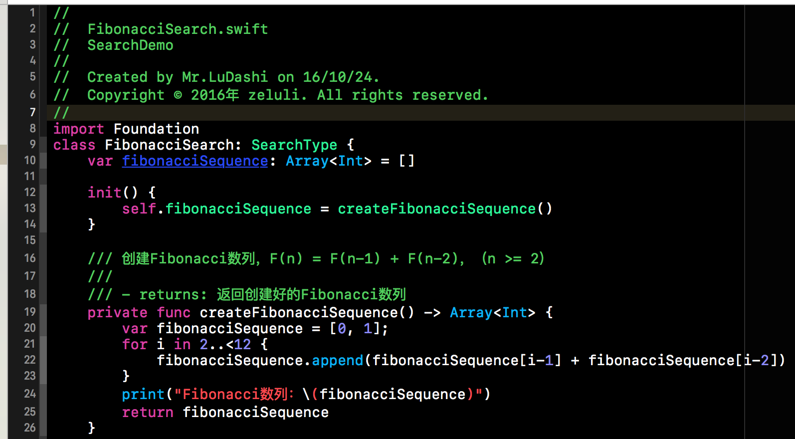 首先我们先根据Fibonacci数列的规则,来生成Fibonacci数列备用。下方这个就是我们生成Fibonacci数列的方法。下方的FibonacciSearch类就是我们Fibonacci查找的类,其中的fibonacciSequence中存储的就是我们的fibonacci数列。下方的 createFibonacciSequence()方法就是创建Fibonacci数列的方法。如下所示: