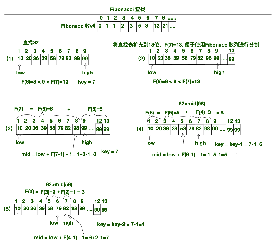 说白了,Fibonacci查找其实就是使用Fibonacci数列将查找表进行分割,然后求出mid的位置,将关键字与mid进行比较,然后决定是抛弃后半部分还是前半部分。下方是使用Fibonacci数列查找82在相应查找表的具体步骤。