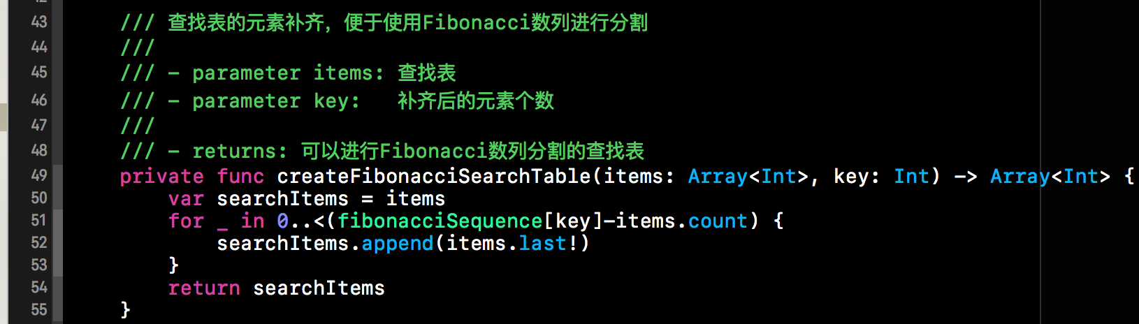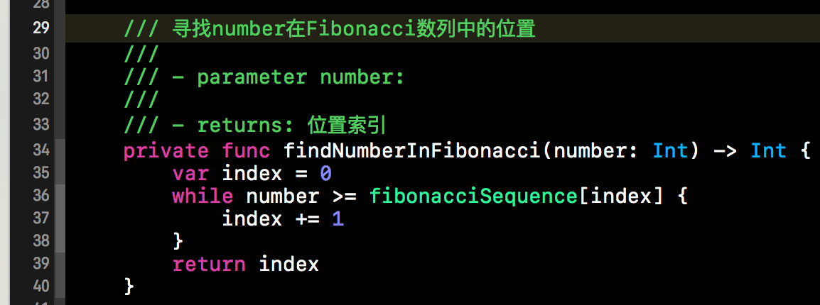 原理分析完毕后,给出代码实现不是什么难事呢。大体结构与二分查找依然类似。就是根据Fibonacci数列来计算mid的值,然后不断的缩小查找表的范围。首先我们需要查找当前查找表需要扩展到几个元素可以被Fibonacci数列进行分割。下方这个函数就是计算查找表扩展后的元素的个数。findNumberInFibonacci()方法有一个参数, 这个参数就是当前查找表的元素的个数,该方法的返回值就是扩充后查找表的个数。